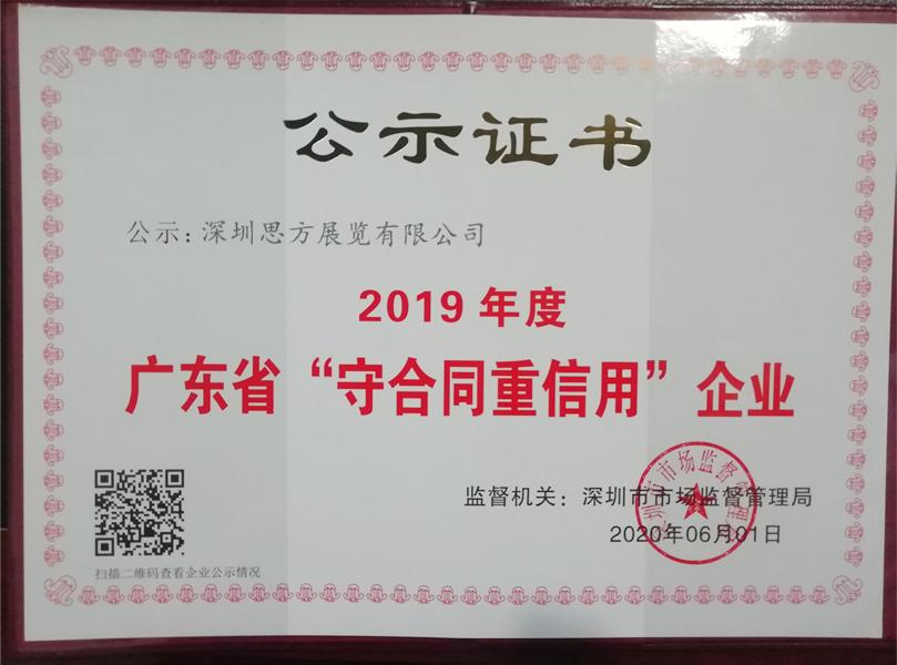 商道酬誠(chéng)!思方展覽榮獲“廣東省守合同重信用企業(yè)”稱號(hào)
